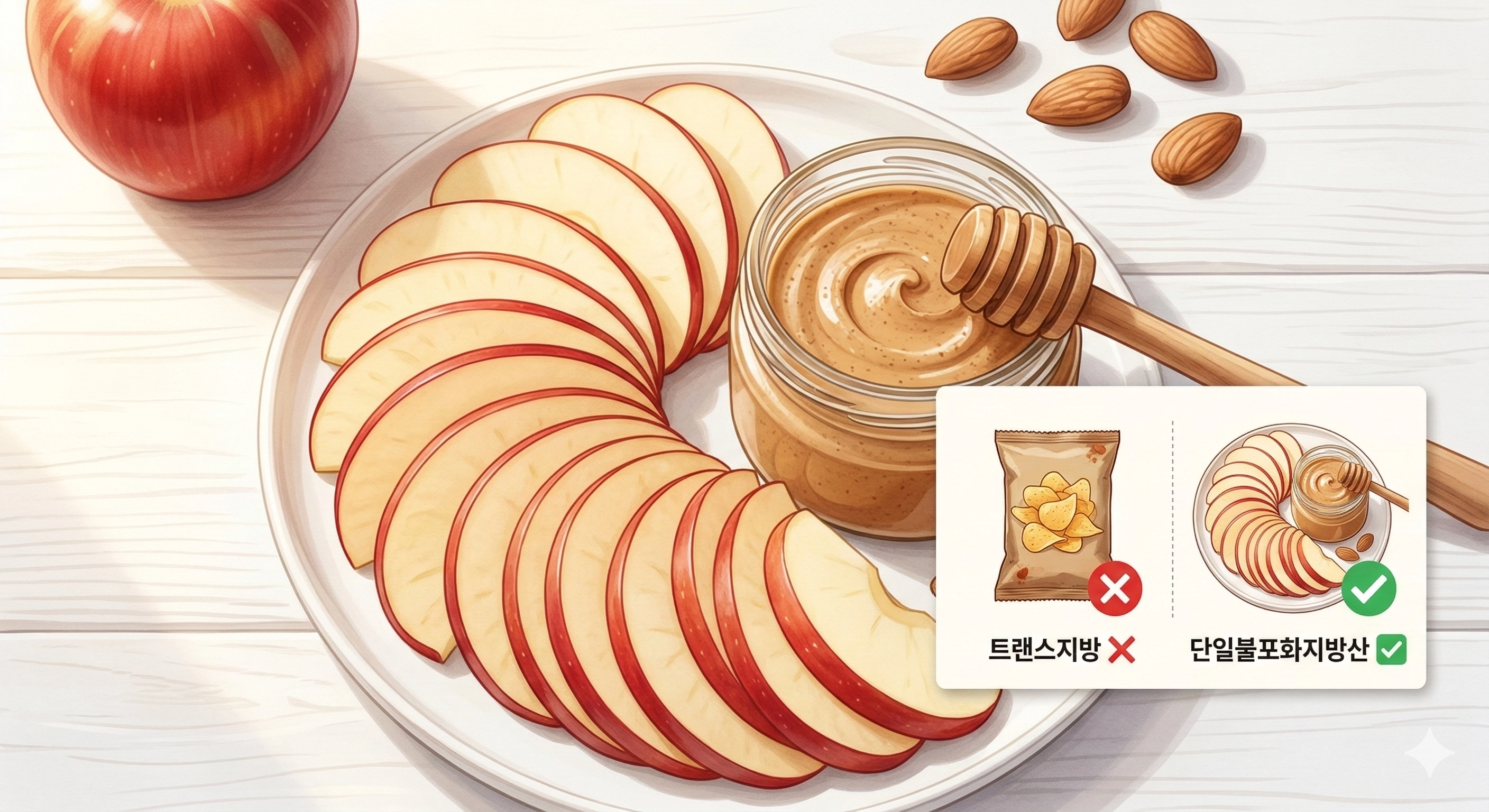 지방간 식단에서 간식은 포기 대상이 아닙니다. 무엇을 포기하느냐가 아니라 무엇으로 대체하느냐의 문제입니다. 트랜스지방 과자 대신 100% 아몬드 버터와 사과를 선택하면, 같은 간식 시간에 간 지방 배출을 돕고 항산화 성분을 섭취하는 기회로 바꿀 수 있습니다.