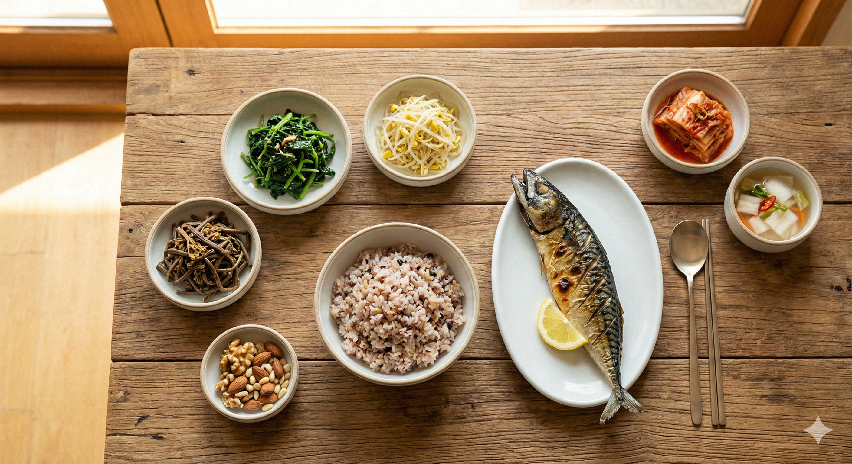 한국인은 잡곡밥, 나물 반찬, 고등어구이, 견과류 간식으로 쉽게 적용할 수 있습니다.