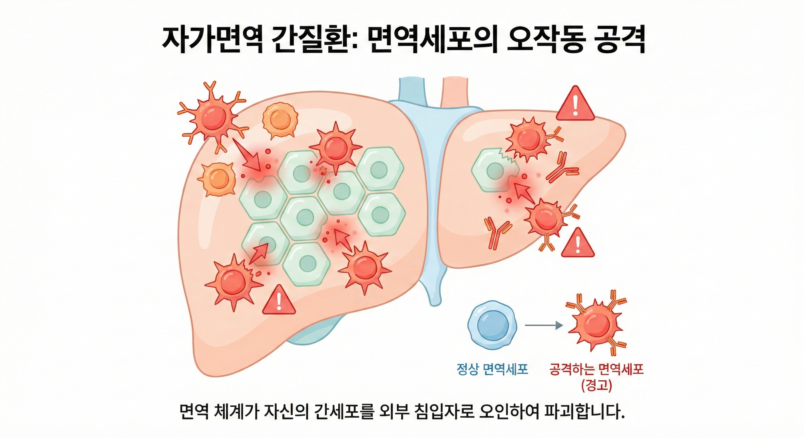 정상적인 면역체계는 세균이나 바이러스 같은 외부 침입자만 공격합니다. 그러나 면역 균형이 무너지면 자신의 정상 세포까지 공격하게 되는데, 그 표적이 간이 되면 자가면역 간질환이 발생합니다.